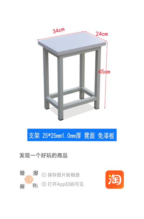 1 | 方凳 | 180 | 1.凳长34cm,宽24cm,高45cm。 2.凳面灰白色,厚2.5cm,圆角。材质:免漆板。 3.凳腿支架白色方管,宽度2.5cm*2.5cm,厚度1mm,焊接精细。凳脚加防滑垫。 4.具体样式见图。