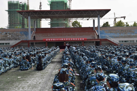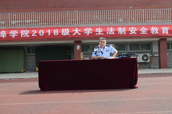 9月12日上午,2018级新生法制安全教育课在第一运动场举行,蚌埠市公安局龙湖派出所副所长丁永利应邀前来授课,2018级全体学生在教官的带领下,精神抖擞、士气高涨,以营为单位整齐地坐在运动场上聆听讲座。